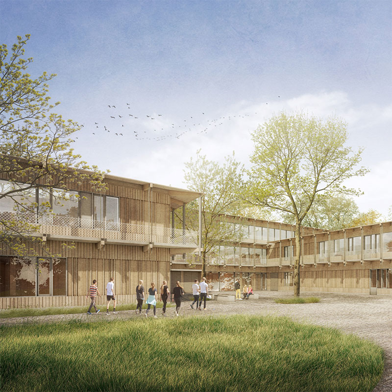 Facade: Timber Mullion-Transom Curtain Wall Facade; Rear-Ventilated Rainscreen Facade with Fiber Cement Cladding