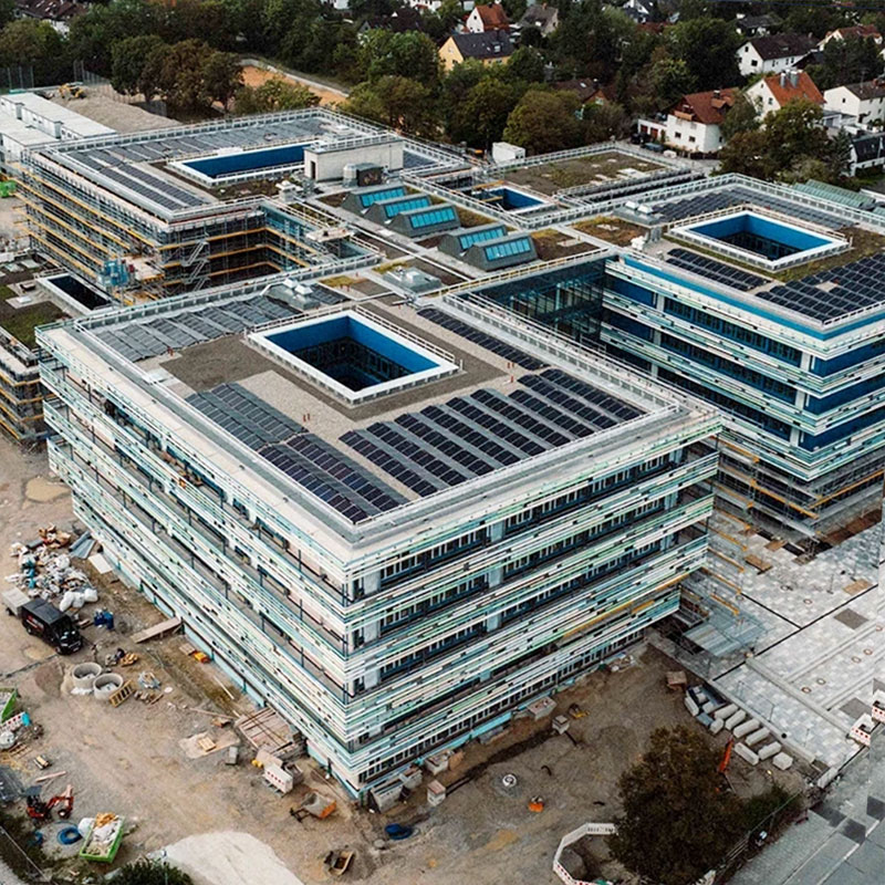 Facade: Aluminium and Steel Mullion-Transom Curtain Wall Facade; Ventilated Rainscreen System with Sheet Metal Cladding; Building-Integrated Photovoltaic (BIPV) Cladding