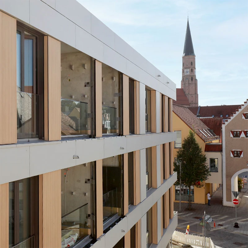 Facade: Timber Mullion-Transom Curtain Wall Facade; Rear-Ventilated Rainscreen Facade with Sheet Metal Cladding; Perforated Aluminium Panels