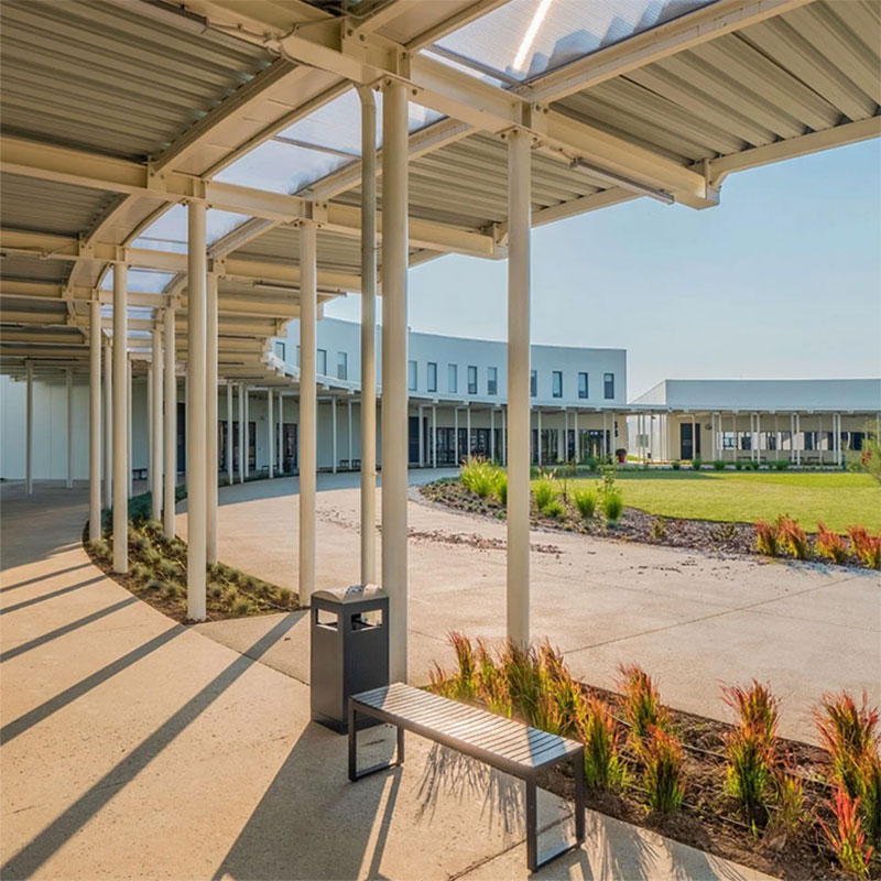 Facade: Insulated Metal Panel (IMP); Thermally Broken Windows; Walkway Canopy with Roof Light; Structural Steel